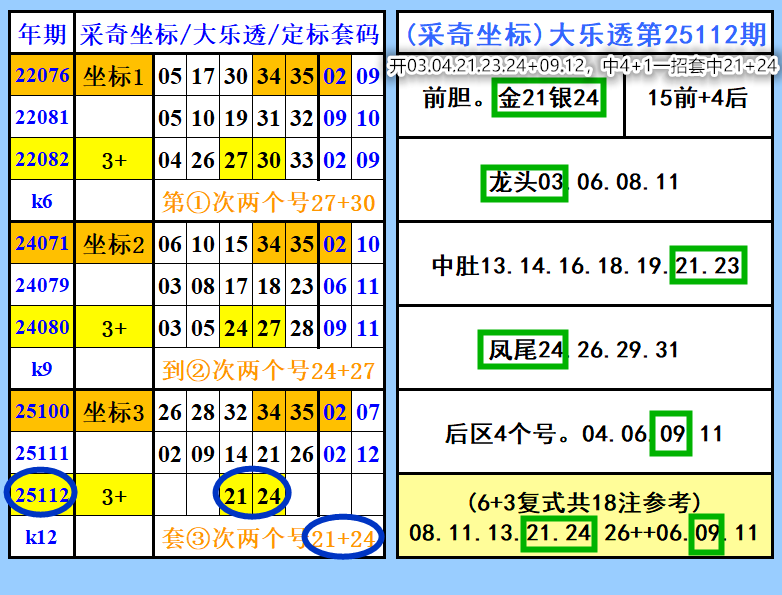 视频(采奇坐标)经典回顾,大乐透第25112期,中4+1一招套中21+24