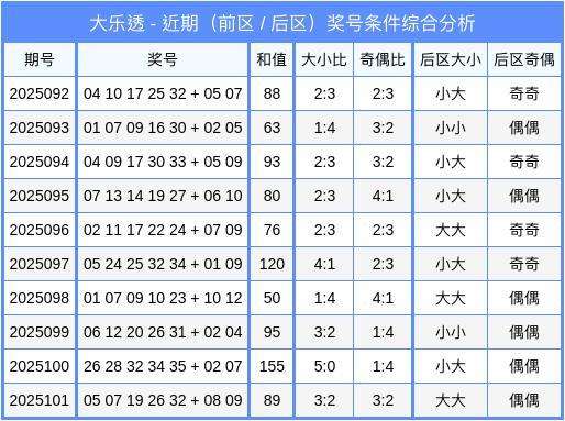 大乐透第2025101期开奖号码:前区05、07、19、26、32;后区08、09。前区号码大小比为3:2,奇偶比为3:2,后区开出偶奇、大大组合。