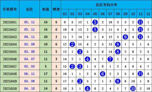 上期后区号码为04号和10号,为小大偶偶组合,近10期后区大小比为10:10,奇偶比为11:9,012路比为5:4:11;本期参考小大组合04 08。