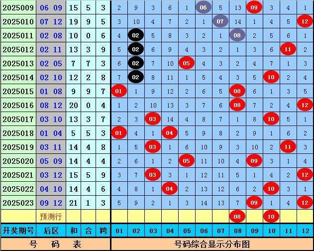 后区奖号分析:上期后区奖号为09+12,遗漏期数为2期和1期,目前后区号码01-12分别遗漏:5期、9期、2期、1期、3期、14期、13期、7期、0期、1期、4期、0期,本期后区注意号码01、06、08、10、12,两码关注08、10。