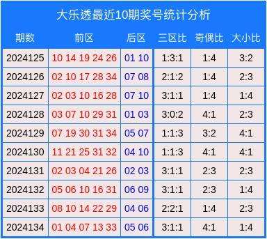 其中前区的三区比为3:1:1,奇偶比为4:1,大小比为1:4。