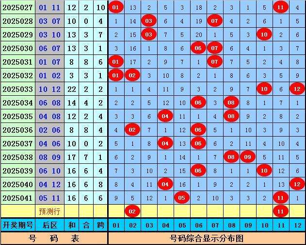 后区分析:上期后区开出全奇、全2路组合05、11,最近10期后区奖号奇偶比为4:16,偶数号码走势活跃,后区奖号012路比为7:6:7,本期预计出现在02、06、08、09、11之中,两码单挑02、11。