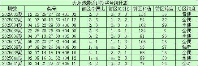 大乐透第2025041期开奖,前区:03、04、21、22、27;后区:05、11。其中前区和值为77,跨度为24,012路比为3:2:0,奇偶比为3:2,后区开出全奇、全2路组合。