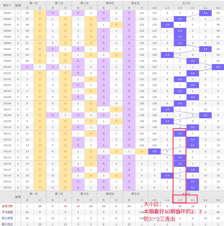 上期大小比:3:2,近10期大小比出现情况:2:3、3:2、3:2、0:5、2:3、2:3、3:2、1:4、3:2、3:2,最近10期出现5期3:2,出现3期2:3,出现0期4:1,出现1期1:4,出现0期5:0,出现1期0:5,根据近10期规律本期看好10期循环的2:3,防3:2三连出,综上所述推荐大小比推荐:3:2,重点关注:2:3。