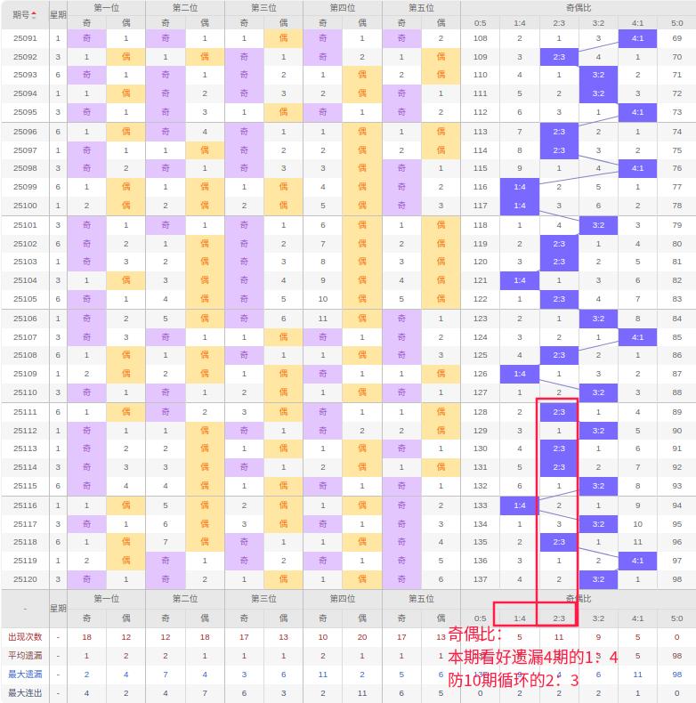 上期奇偶比:3:2,近10期奇偶比出现情况:2:3、3:2、2:3、2:3、3:2、1:4、3:2、2:3、4:1、3:2,最近10期出现4期3:2,出现4期2:3,出现1期4:1,出现1期1:4,出现0期5:0,出现0期0:5,根据近10期规律本期看好遗漏4期的1:4,防10期循环开出2:3,综上所述推荐奇偶比推荐:2:3,重点关注:1:4。