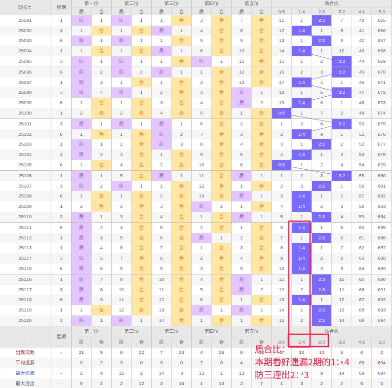 上期质合比:2:3,近10期质合比出现情况:1:4、2:3、1:4、1:4、1:4、2:3、2:3、1:4、2:3、2:3,最近10期出现0期3:2,出现5期2:3,出现0期4:1,出现5期1:4,出现0期5:0,出现0期0:5,根据近10期规律本期看好遗漏2期开出1:4,防三连出2:3,综上所述推荐质合比推荐:2:3,重点关注:1:4。
