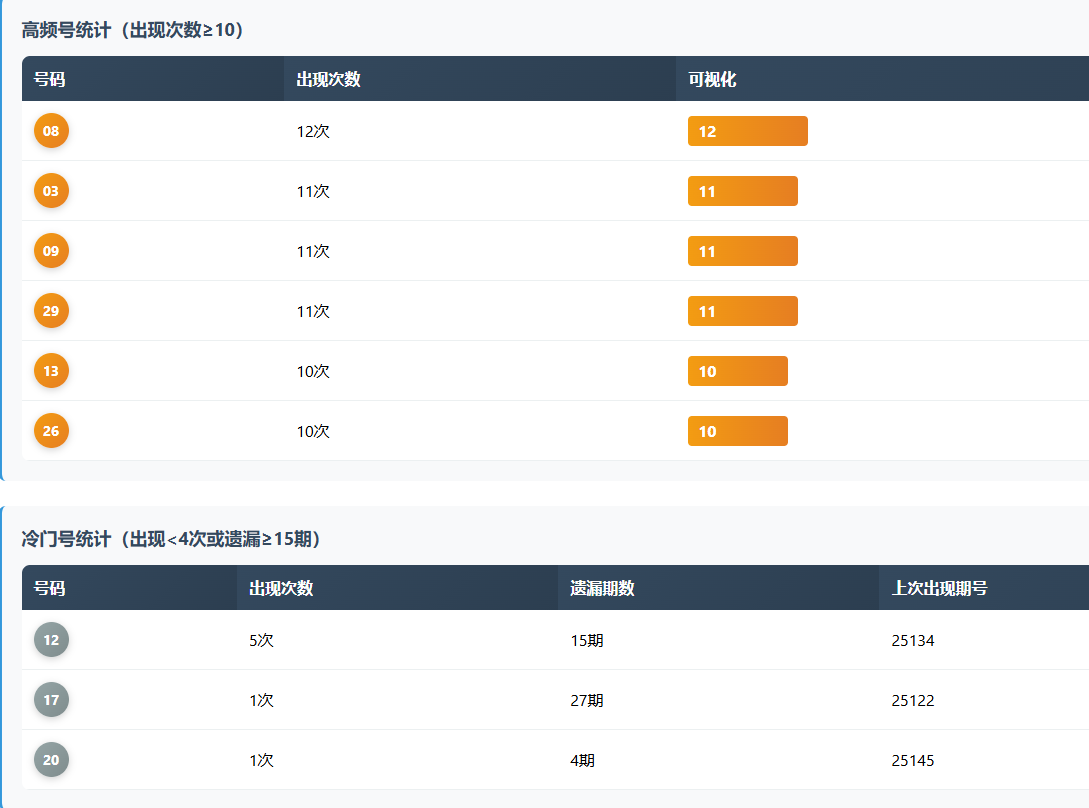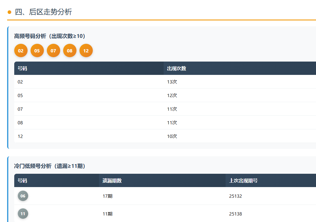 目前高频号中,02(13次)、05(12次)、07和08(各11次)是绝对的四大天王。而冷门方面,06已经遗漏了17期,11遗漏了11期。