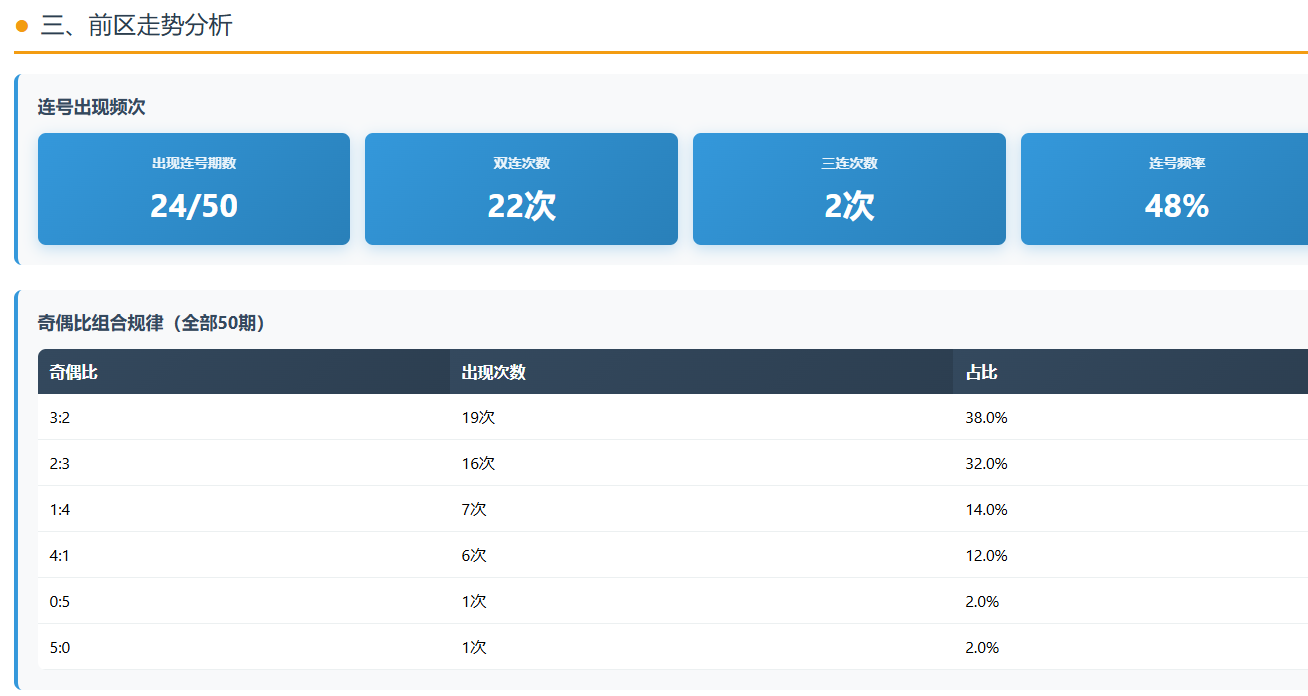 2. 连号与重号的粘性分析 连号在近50期中出现的频率是48%,也就是说,几乎每两期就会有一期出现连号。不过,三连号(如上期的30-31-32)属于稀有事件,50期内仅出现了2次。按照常理,在出现这种极度密集的连号后,下一期号码往往会趋向于发散。