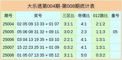 大乐透第25008期开出奖号为:01、05、07、13、35 + 05、12,前区三区比3:1:1,奇偶比为5:0,012路比为0:3:2,无重号。
