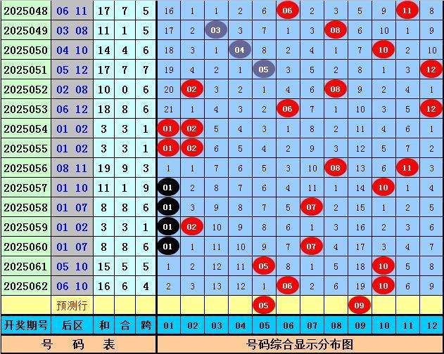 后区分析(一区01-04,二区05-08,三区09-12):上期后区开出奖号06和10,最近10期后区三区落号比为9:12:5,本期后区关注号码01、02、05、08、09,后区两码参考05、09。
