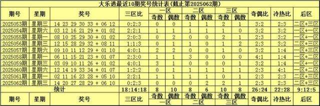 前区三区走势:上期前区奖号三区比为0:2:3,最近10期前区奖号三区比为18:14:18。
