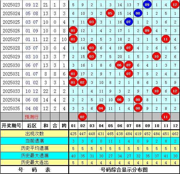 后区分析:在第036期历史同期开奖中,后区奖号全奇组合开出2次,全偶组合开出4次,一奇一偶组合开出12次,本期后区预计出现一奇一偶组合,看好号码02、03、09、11。