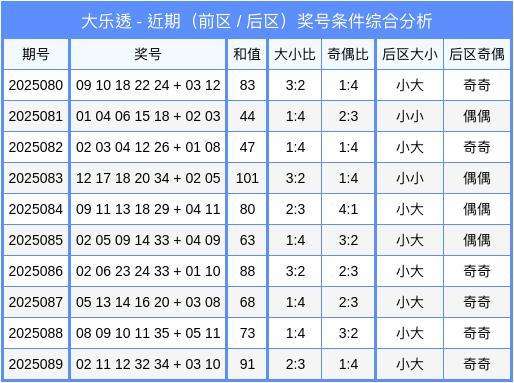 大乐透第2025089期开奖号码:前区02、11、12、32、34;后区03、10。前区号码大小比为2:3,奇偶比为2:3,后区开出奇偶、小大组合。