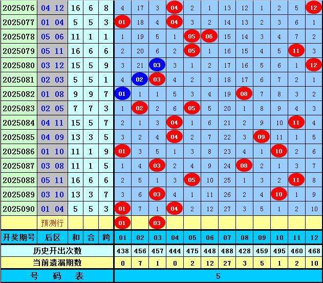 后区分析:上期后区开出一奇一偶、全小奖号01、04,近10期后区奖号奇偶比为11:9,奇偶号码开出个数基本相等,后区奖号大小比为7:13,小 号相对较热,本期预计后区奖号出现在01、03、07、08、10中,参考号码01、03。