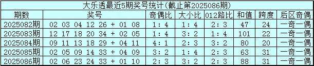 体彩大乐透第25086期奖号为:02 06 23 24 33+01 10,前区奇偶比为2:3,大小比为3:2,012路比为3:0:2,和值为88,跨度为31,后区开出一奇一偶组合。