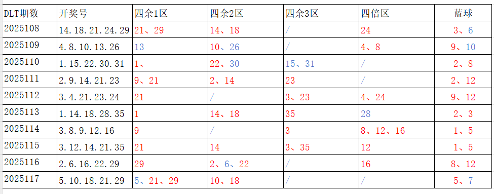 如图,红色字体是重复开出的号码,即为热号。蓝色字体是开出一次的号码,即为冷号。以近10期为一个分析周期:4余1区、4余2区,走势较热;4余3区、4倍数区,走势较冷。依据久热必冷,久冷必热的规律,本期重点关注:4余1区、4余2区,区间号码可能开出2-3个;4余3区、4倍数区,区间号码可能开出1-2个。区间冷热号码精选:***(会员专区可见)。个人分析,仅供参考。