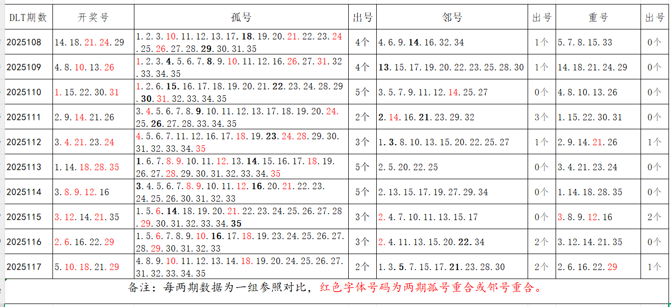 如图,以近两期数据为一组,进行对比分析,相同的孤号、邻号可能在下期开出。本期参考孤号:1.2.3.7.8.12.13.14.15.16.23.24.25.26.27.31.32.33.34.35;邻号:4.6.9.11.17.19.20.22.28.30。重点关注:孤邻号重合号码:***(会员专区可见)。个人分析,仅供参考。