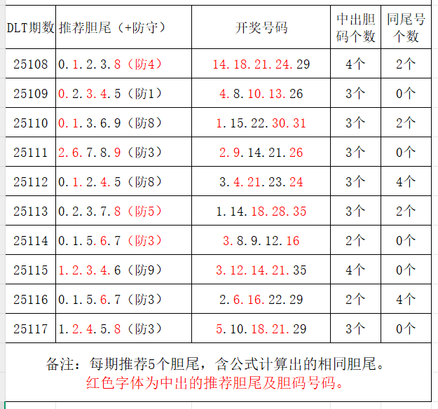 如图,每期推荐胆尾中出1-4个。上期推荐胆尾中出3尾3码!推荐胆尾是按照公式计算的顺序,不定位红球号码的顺序。本期推荐胆尾:6尾/3尾/2尾/4尾/9尾,加推防守胆尾+胆码号码:***(会员专区可见)。个人分析,仅供参考。