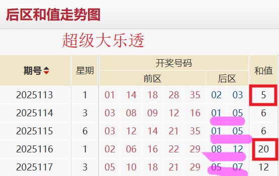 近五期大乐透开奖号码后区和值依次为5→6→6→20→12。后区和值均值为10。后区和值振幅为15,后区和值修正振幅为12。基于动态平衡干预以及波动趋势衡量,本期后区和值推测区间为3-22。基于风险对冲策略,本期后区和值区间缩水为7-17。