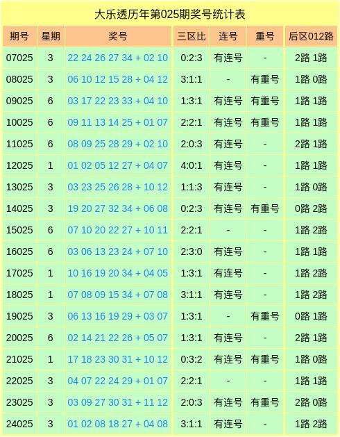 前区重号:在第025期历史同期开奖中,有7期奖号包含了重号,重号出现比例为38。89%,今年同期预计出现1个去年第025期前区重号,参考重号23。