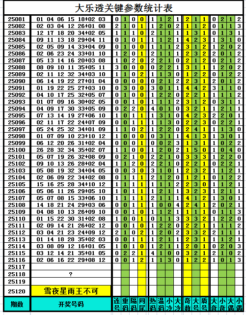 以下是作者手工统计的大乐透关键参数统计表,对喜欢参数分析、过滤缩水、选号胆杀的技术性大乐透爱好者有所帮助,其它读者可略过不看。
