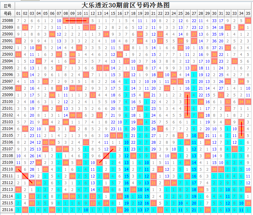 上期热、温、小、大冷1130组合形态。追踪数据请参考前面的大乐透关键参数统计表。