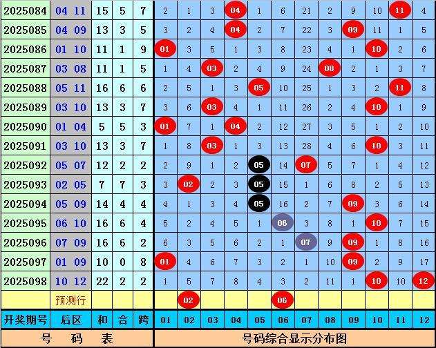 后区号码分析:在第099期历史同期开奖中奖,奖号05出现6次,奖号07出现5次,奖号01出现4次,奖号04 06 08 10 12出现3次,奖号03出现2次,奖号02 09出现1次,奖号11没有出现。本期后区五码参考02、04、06、08、12。