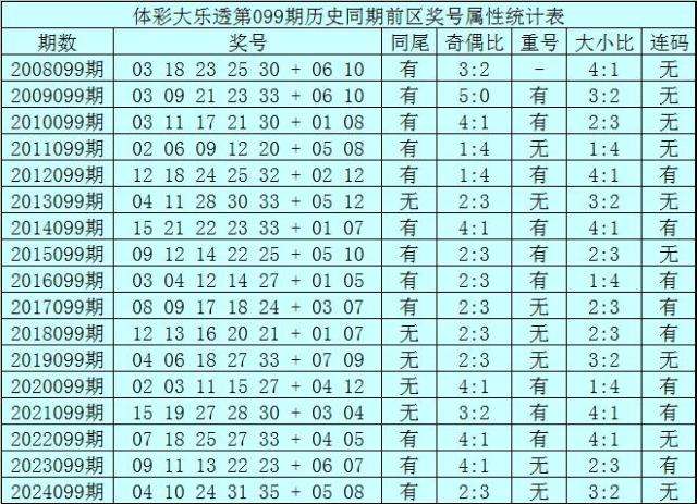 体彩大乐透第099期历史同期开出17次奖号,其统计详见下表: