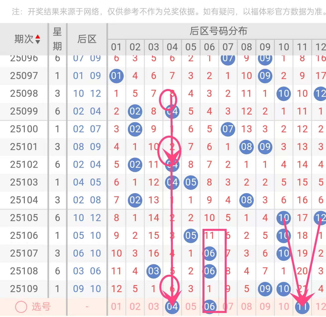 06:后区热号。近30期出现11次,频率达37%。与04形成跨度2的合理搭配。