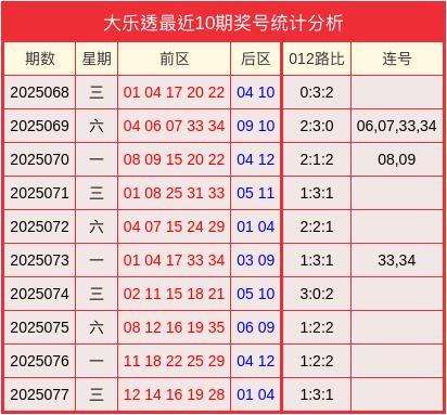 开奖回顾:大乐透2025077开奖号码为12、14、16、19、28+01、04。其中012路比为1:3:1、无连号。