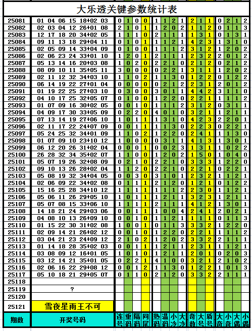 以下是作者手工统计的大乐透关键参数统计表,对喜欢参数分析、过滤缩水、选号胆杀的技术性大乐透爱好者有所帮助,其它读者可略过不看。