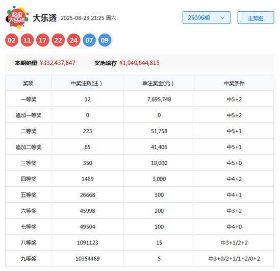 大乐透第2025096期开奖号码为:02、11、17、22、24+07 09。其中前区奖号三区比为2:2:1,奇偶比为2:3,没有开出重号,后区分布在二、三区。