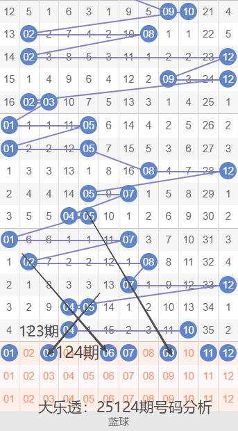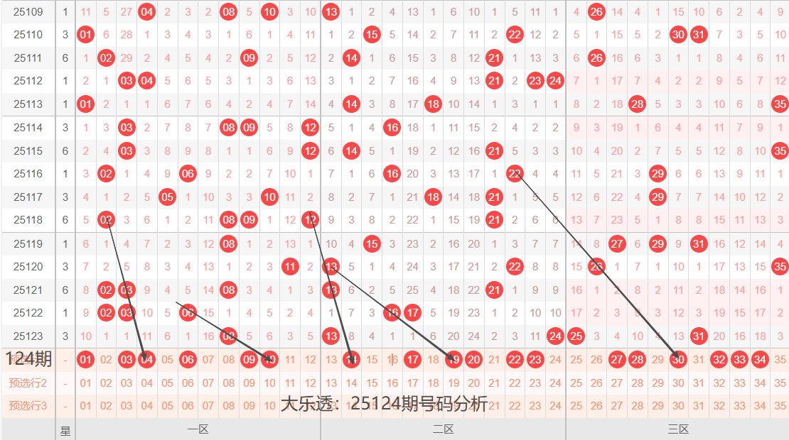通过上期号码的简单分析,我们看下25124期红色号码球的总体走势,如下图: