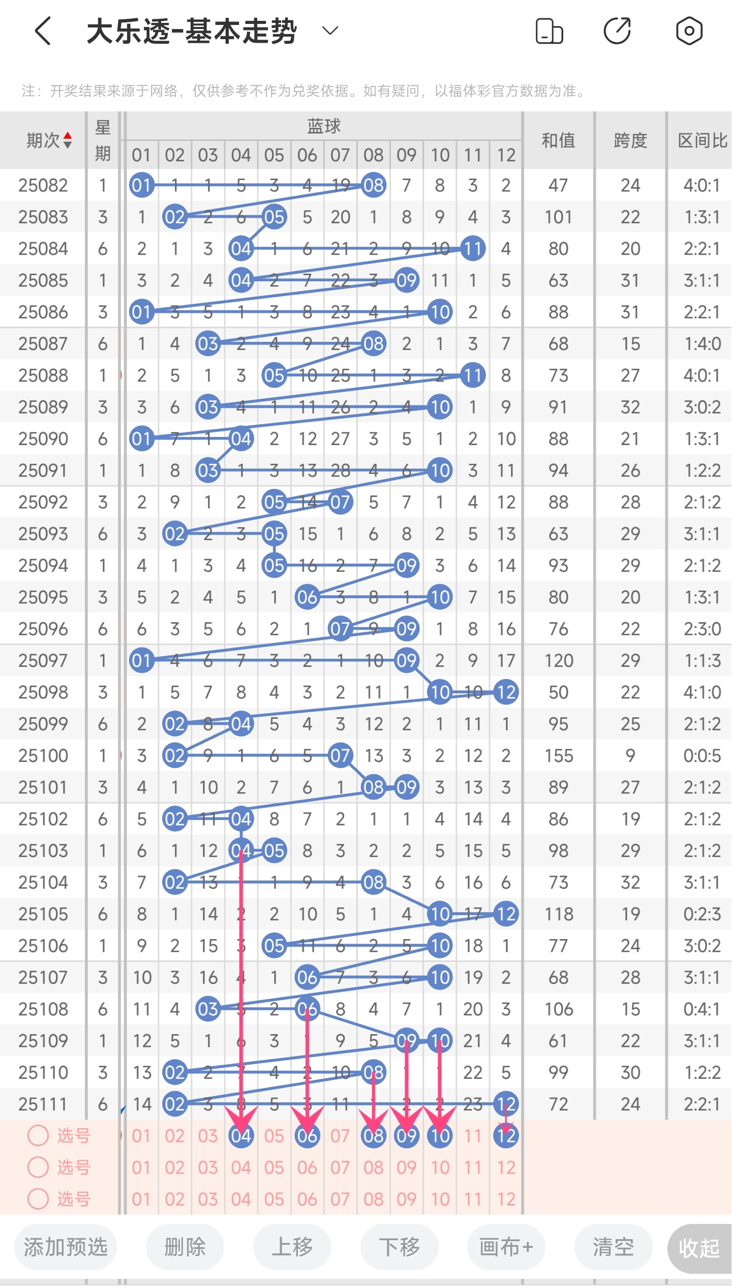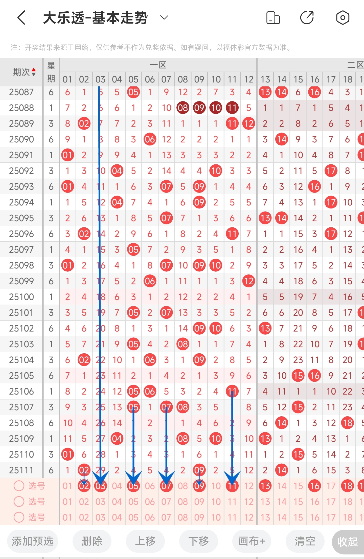上一期开出02和09号球。往前一期开出01号球。通过走势图分析,可以看到近3期龙头开了左边的位置的号码。所以本期有较大概率可能会保持这样的态势,继续往左边开。但也可能回归到之前强势的中间位置的号码。而右边也有小概率回归。所以本期我们主要关注左边和中间的号码,最后是右边的。然后再结合遗漏期数和冷热号,本期我们可以关注一下02,03,05,07,09,11等号。综上所述本期我们推测02,03,05,07,09,11号球可能会开出。