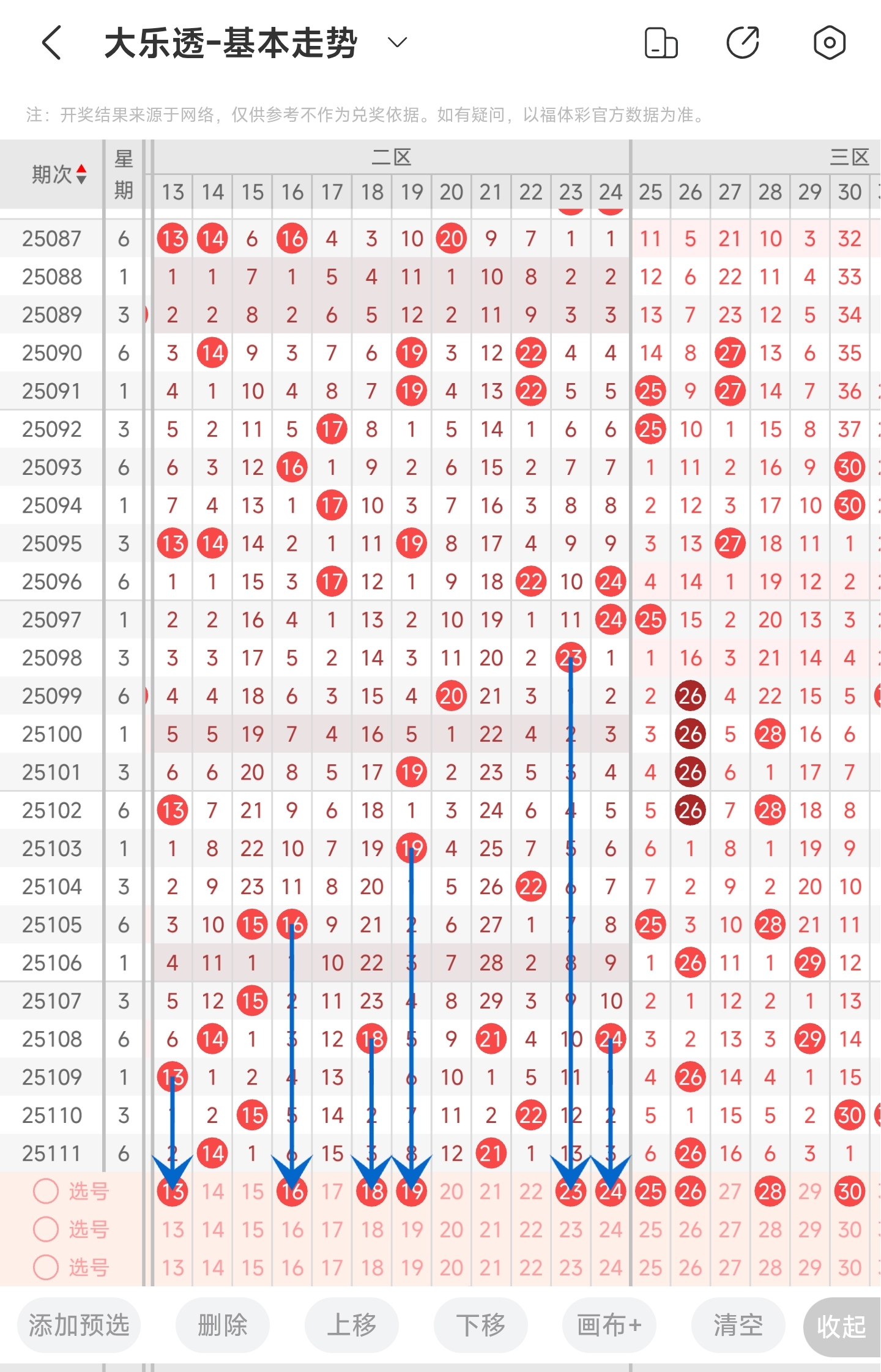 上一期三区开出26号球,往前一期开出30,31号球。通过分析走势图,可以看到近几期凤尾开号有往左边和中间开的趋势,本期可能依旧如此,但要防一下回归右边的可能。所以本期我们主要关注左边和中间部分的号码,再兼顾一下右边的号。然后结合冷热号和遗漏期数,本期我们可以关注25,26,28,30,33,35等号。综上所述本期三区我们推测可能会开25,26,28,30,33,35等号码。