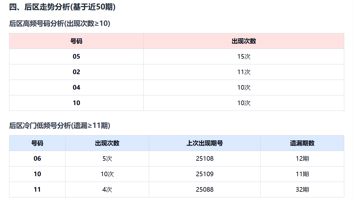 基于近50期统计,后区高频:05(15次)、02(11次)、04(10次)、10(10次)。冷门与遗漏值得注意:06(遗漏12期)、11(遗漏32期)。
