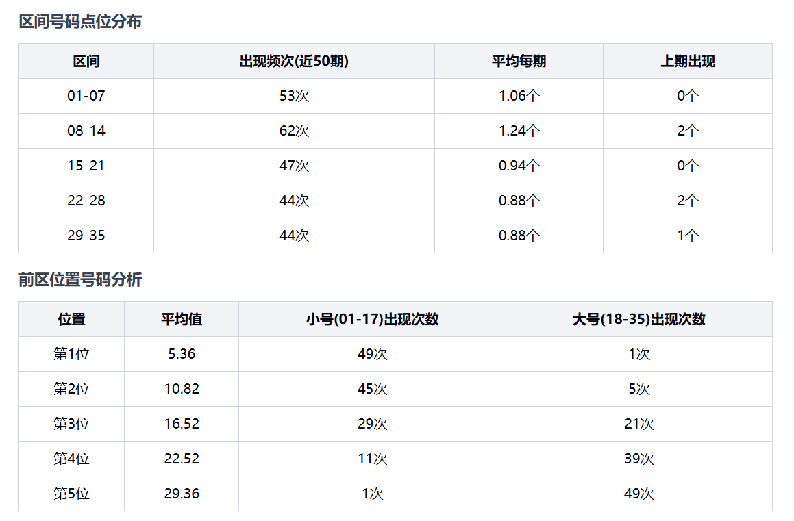 08–14、15–21、22–28、29–35 五段有各自波动,上期在 08–14 和 22–28 段各有号码出现(前区出现 2、2)。