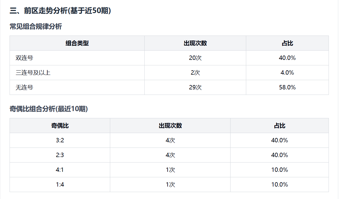 连号:近50期中出现双连号约 20 次(占比 40%),三连及以上非常少(4%),说明短连(双连)是常态,三连基本是例外。