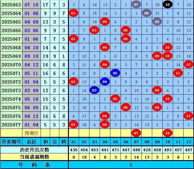 前区第一位:在历史第078期同期开奖中分布范围在01-19区段,平均值为6。3,奇偶比为8:10,去年同期开出奇数号码之后,今年第078期预计再出奇数号码,关注号码01。