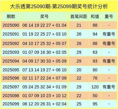 上期前区和值为95,无重号,无连号,首尾间距为25。