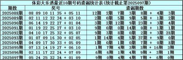 体彩大乐透第2025097期奖号为:05 24 25 32 34 + 01 09,前区号码奇偶比为2:3,大小比为4:1,和值为120,012路比为1:2:2,后区号码奇偶比为2:0,大小比为1:1。