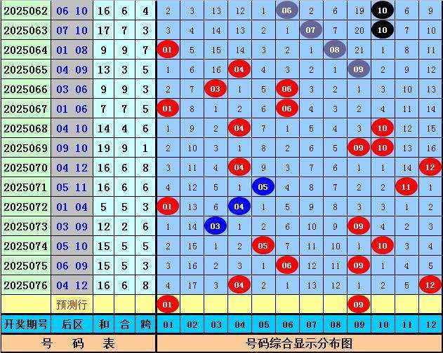 后区号码分析:在第077期历史同期开奖中奖,奖号06出现6次,奖号01出现5次,奖号02 12出现4次,奖号03 05 08 09出现3次,奖号07 10出现2次,奖号04出现1次,奖号11没有出现。本期后区五码参考01、07、09、10、11。
