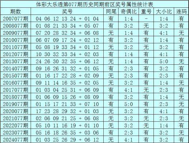 体彩大乐透第077期历史同期开出18次奖号,其统计详见下表: