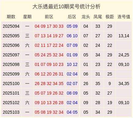 后区分析:近十期后区奖号的大小比为10:10,上一期开出小小数04、05,本期关注后区开出小大数05、10。