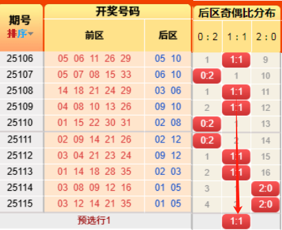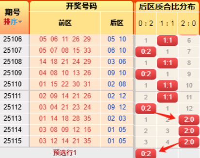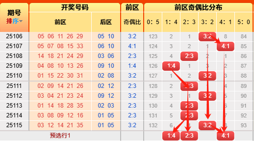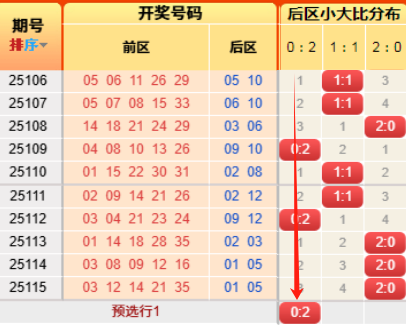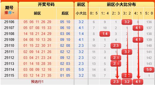 上期前区小大比3:2,小车命中啦!近期统计44期中39期。言归正传我们继续用历史数据说话,前区小大比分成6种0:5、1:4、2:3、3:2、4:1、5:0(如图),我统计了一下历史出现次数,0:5出现106次、1:4出现513次、2:3出现961次、3:2出现802次、4:1出现348次,5:0出现52次,再看近10期小大比出现次数比为0:1:3:3:2:1,通过历史数据对比观察以及根据遗漏对称理论原则,故本期我们选择2:3、4:1、3:2;(具体精准方向请查看小车小大比精选)