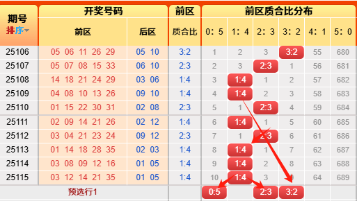 上期质合1:4,又单选命中啦,近36期命中34期范围。来看历史次数统计0:5出现268次、1:4出现900次、2:3出现1001次、3:2出现507次、4:1出现100次、5:0出现7次,再看近十期质合比出现的次数比0:6:3:1:0:0,冷值5:0暂时放弃,再结合图形来看,本期趋势看顺路,初步选择为3:2、0:5、2:3。(具体请点击本条上车查看精选质合比 )