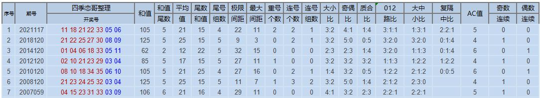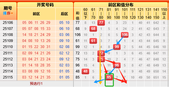 上期开出和值85,命中区间数值。本次我们先根据历史次数统计,和值60以下开出244次、61-70开出234次、71-80开出366次,81-90开出478次、91-100开出491次,101-110开出377次、111-120开出312次、121-130开出155次、131-140开出90次、141-150开出26次、150以上开出9次,再来看近十次以上和值分别开出了1次、2次、3次、1次、2次、1次、0次、0次、0次、0次、0次 ,低于阈值的有60区间以下、61-70区间、81-90区间、91-100区间、101-110区间、121-130区间,再根据遗漏斜率对称理论,本期注意61-70区间、71-80区间、81-90区间、101-110区间。