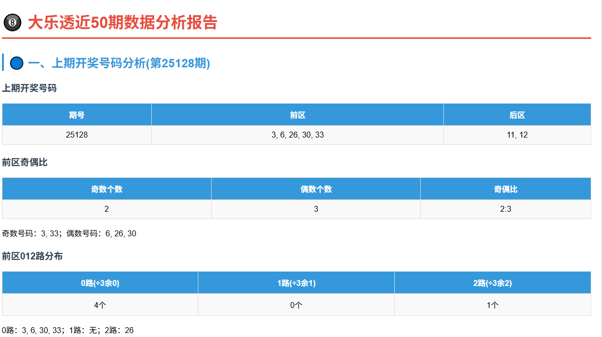 上期前区开出了:3、6、26、30、33;后区是11、12。