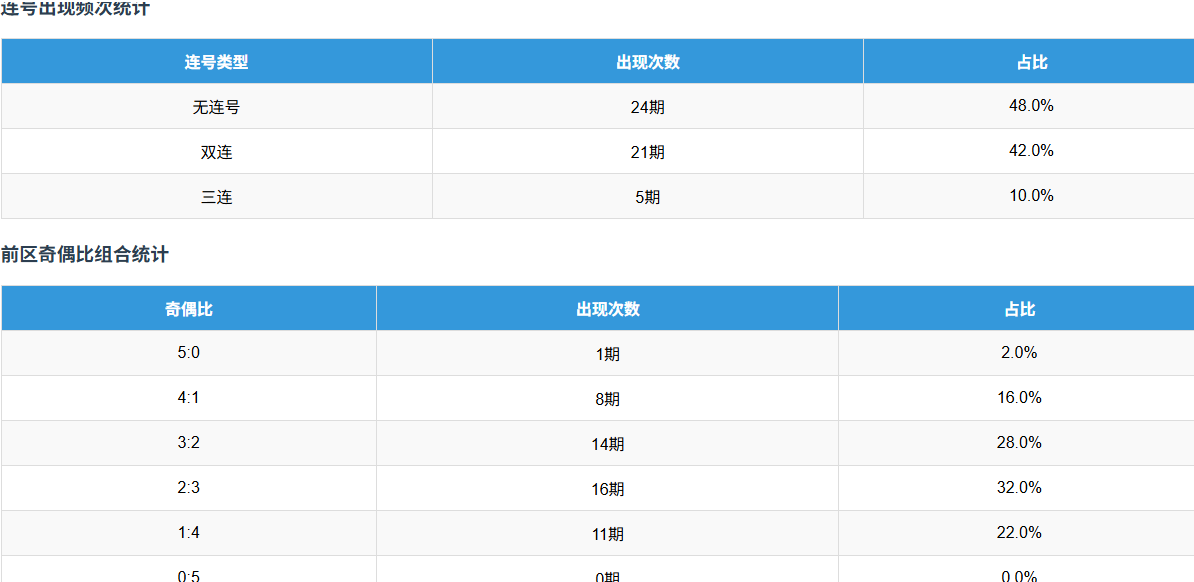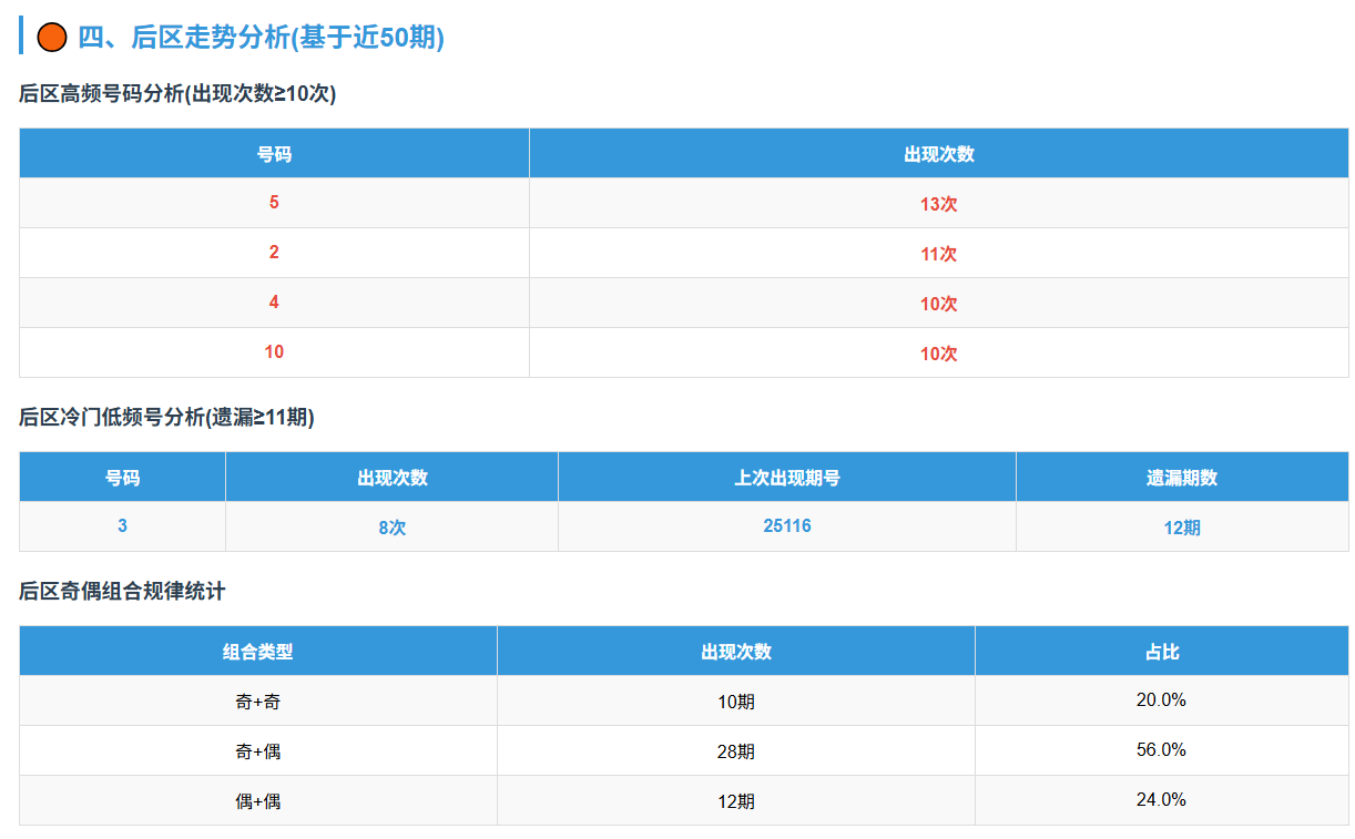 后区的格局近50期内非常有节奏感。奇偶组合方面,“奇+偶”组合出现最多,占比56%;大小组合中,“小+大”也是最高频模式,占56%。