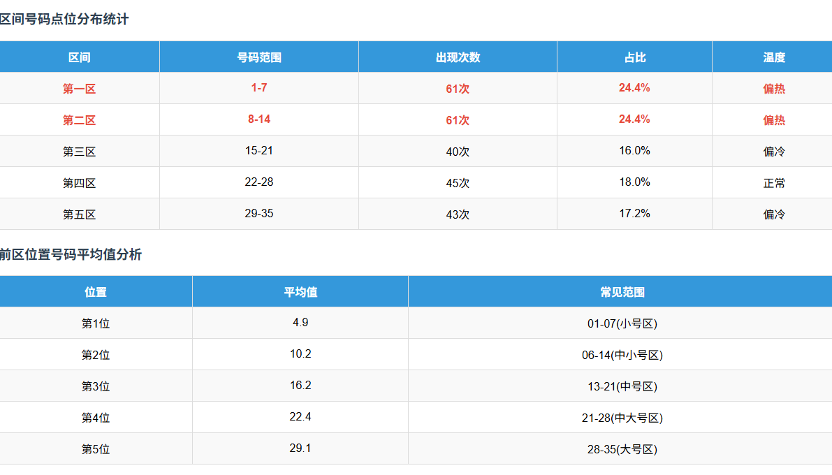 如果把35个前区号码分成五个区段来看(每7个为一区),就会发现近50期的“热度地图”相当耐人寻味:
